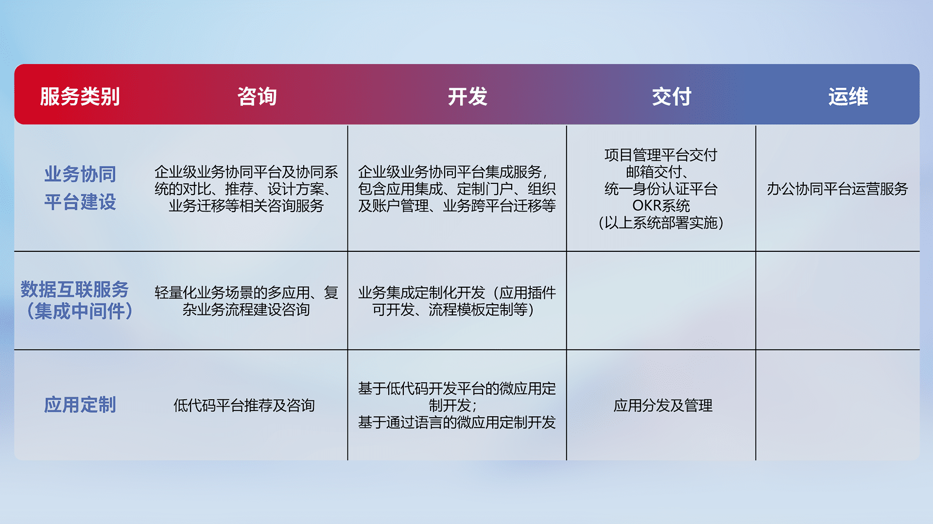 针对钉钉、、企微、、IDaas等平台级产品提供产品的规划、、方案、、交付、、定制化开发等服务,,,,实现如统一协同办公、、、智能客户服务、、、混合会议管理、、、、智能数据查询、、、、等业务场景,,实现数字化转型。。。。