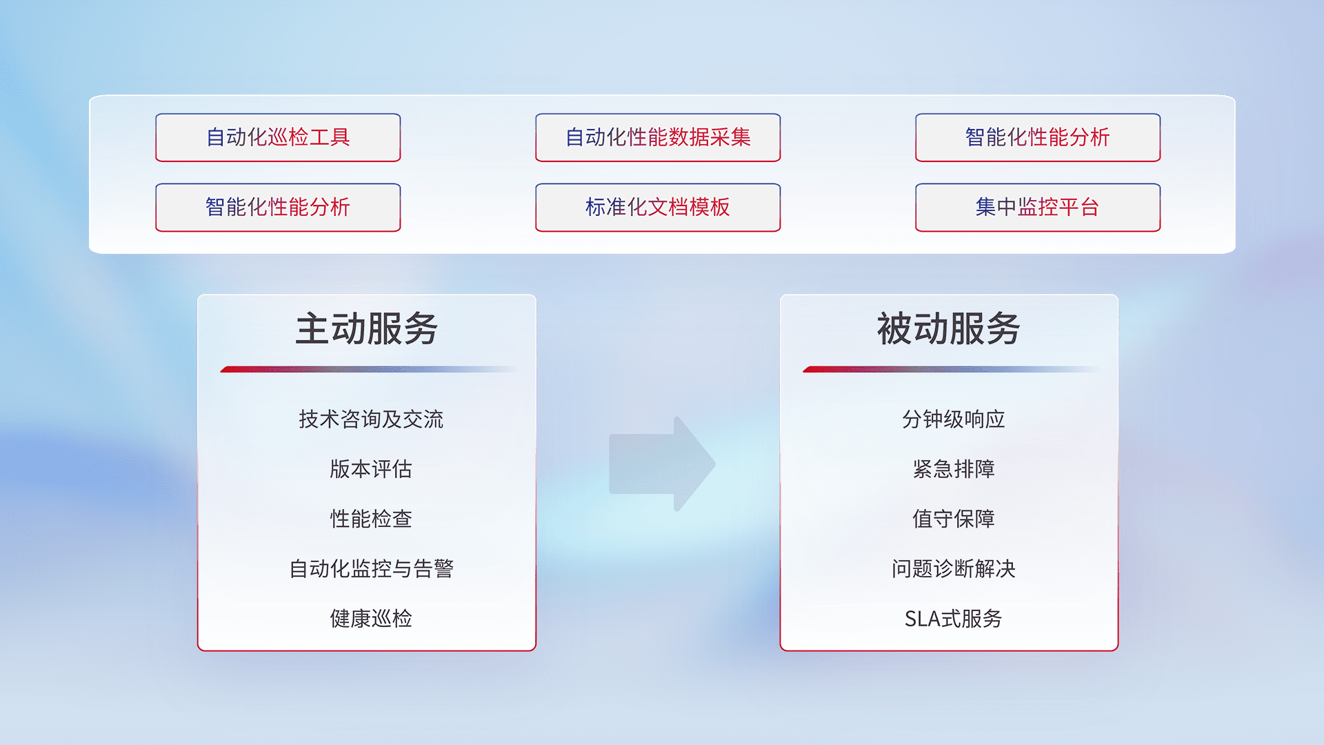 智能化工具和标准化文档,,,,保障服务质量,,,提供主动服务(包含技术咨询、、、版本评估、、、性能检查、、自动化监控与告警、、、健康巡检)和被动服务包含(分钟级响应、、紧急排障、、值守保障、、问题诊断解决、、、SLA服务)。。